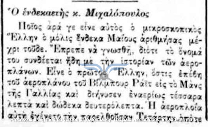Την Τρίτη 30 Σεπτεμβρίου 1908, όσοι αγόρασαν την εφημερίδα ‘’ΑΘΗΝΑΙ’’ είχαν την ευκαιρία να διαβάσουν μια μικρή σε μέγεθος είδηση, μεγάλης ιστορικής σημασίας. Ο αγνώστων λοιπών στοιχείων εντεκάχρονος Μιχαλόπουλος, πέταξε με τον Wilbur Wright στο Le Mans της Γαλλίας! Η πτήση διάρκειας 4 λεπτών και 12 δευτερολέπτων πραγματοποιήθηκε την προηγούμενη του δημοσιεύματος Τετάρτη. Άρα, η ημερομηνία της φερόμενης ως της πρώτης πτήσης Έλληνα με αεροπλάνο, ήταν η 24η Σεπτεμβρίου 1908. Εδώ χρειάζεται να κάνουμε μια χρήσιμη για τη συνέχεια επισήμανση ότι, η Ελλάδα χρησιμοποιούσε το Ιουλιανό ημερολόγιο και η 24/09/1908 αντιστοιχεί στην 7η Οκτωβρίου 1908 στο Γρηγοριανό ημερολόγιο που χρησιμοποιούσε η Γαλλία και εμείς σήμερα.