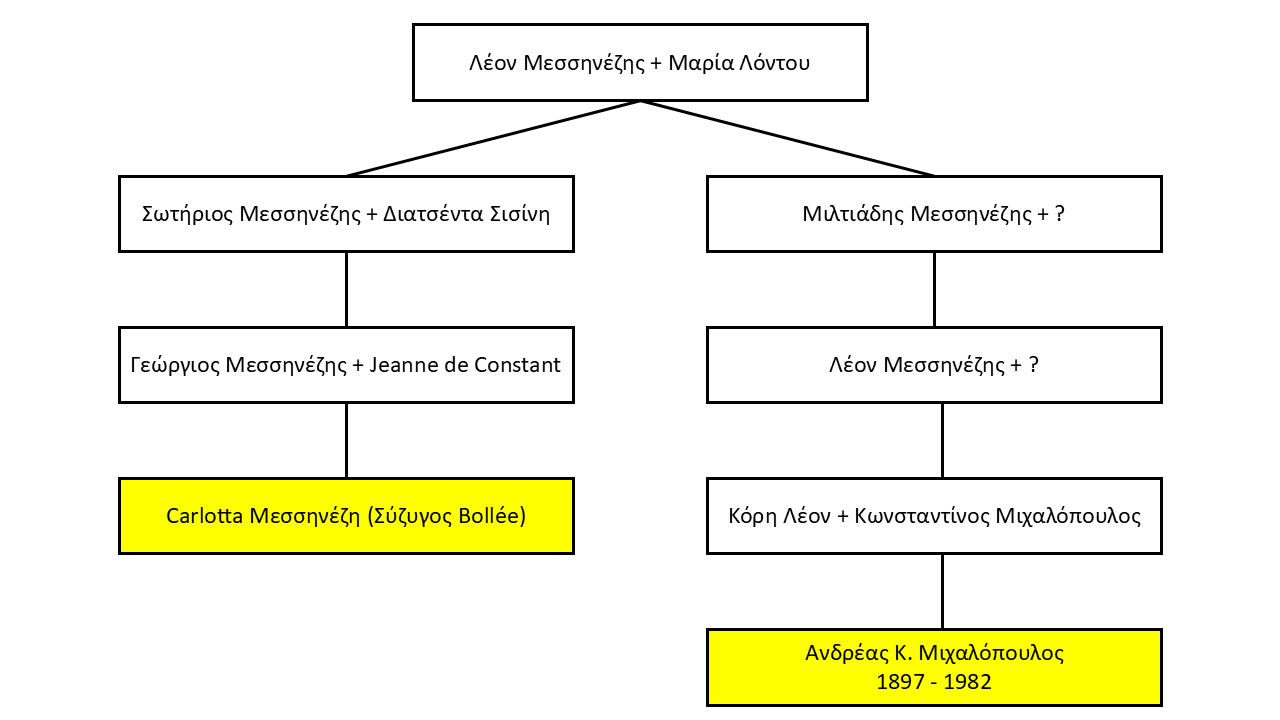 Όσο αφορά την συγγενική σχέση του Ανδρέα Μιχαλόπουλου με την Carlotta Bollée, ευτυχώς για την οικογένεια Μεσσηνέζη υπάρχουν αρκετά στοιχεία. Με βάση δεδομένα που βρέθηκαν στο διαδίκτυο, δημιουργήθηκε ένα υποτυπώδες γενεαλογικό δέντρο που δείχνει την εξ αίματος σύνδεση. Η συγγένεια δεν είναι απόλυτα επιβεβαιωμένη και λογικά απαιτεί επίσκεψη σε αρχεία ληξιαρχείων για ανεύρεση γάμων και γεννήσεων των οικογενειών Μεσσηνέζη και Μιχαλόπουλου.