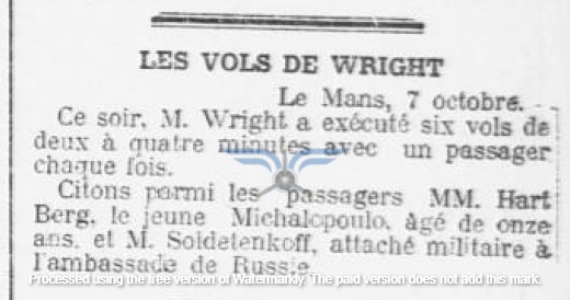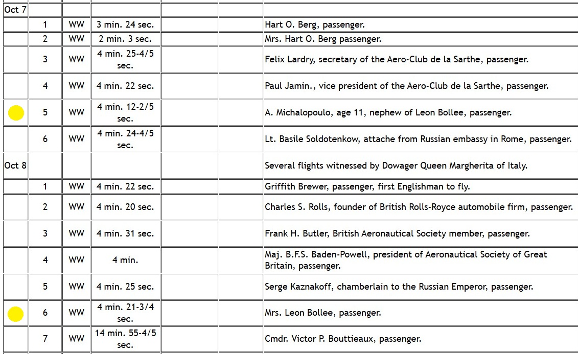 Ανατρέχοντάς στην ημερομηνία 7 Οκτωβρίου 1908, βλέπουμε ότι στην 5η πτήση της ημέρας καταγράφεται ως επιβάτης ο Α. Michalopoulo ηλικίας 11 ετών, ανιψιός του Leon Bollee. Όπως είχε αναφέρει και η εφημερίδα ‘’ΑΘΗΝΑΙ΄΄, η πτήση είχε διάρκεια 4 λεπτών και 12 δευτερολέπτων. Στις 8 Οκτωβρίου παρουσία της Βασίλισσας της Ιταλίας Μαργαρίτας, η σύζυγος του Leon Bollee (Carlotta Μεσσηνέζη) πέταξε για 4 λεπτά και 21 δευτερόλεπτα κατά την 6η πτήση του Wilbur τη συγκεκριμένη ημέρα. Ο ίδιος πίνακας δημοσιεύτηκε και στο βιβλίο που εξέδωσε η NASA το 2003 (WILBUR & ORVILLE WRIGHT – By Arthur George Renstrom)