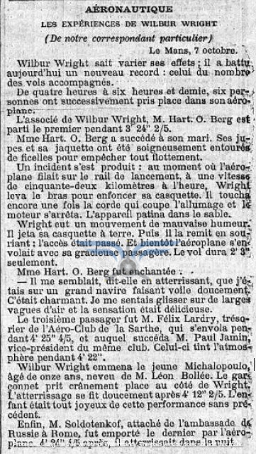 Ο Wilbur Wright βρίσκονταν όντως στο Le Mans εκείνη την εποχή. Για την ακρίβεια πέρασε όλο το δεύτερο εξάμηνο του 1908 στη Γαλλία, με σκοπό να πραγματοποιήσει επιδείξεις του, τροποποιημένου πλέον, ιστορικού Flyer, που αργότερα έγινε γνωστό ως Wright Model A. Η πρώτη του πτήση στη Γαλλία καταγράφτηκε στις 8 Αυγούστου, ενώ από τις 16 Σεπτεμβρίου άρχισε να πετά και με επιβάτες (όλες οι ημερομηνίες με το Γρηγοριανό ημερολόγιο).