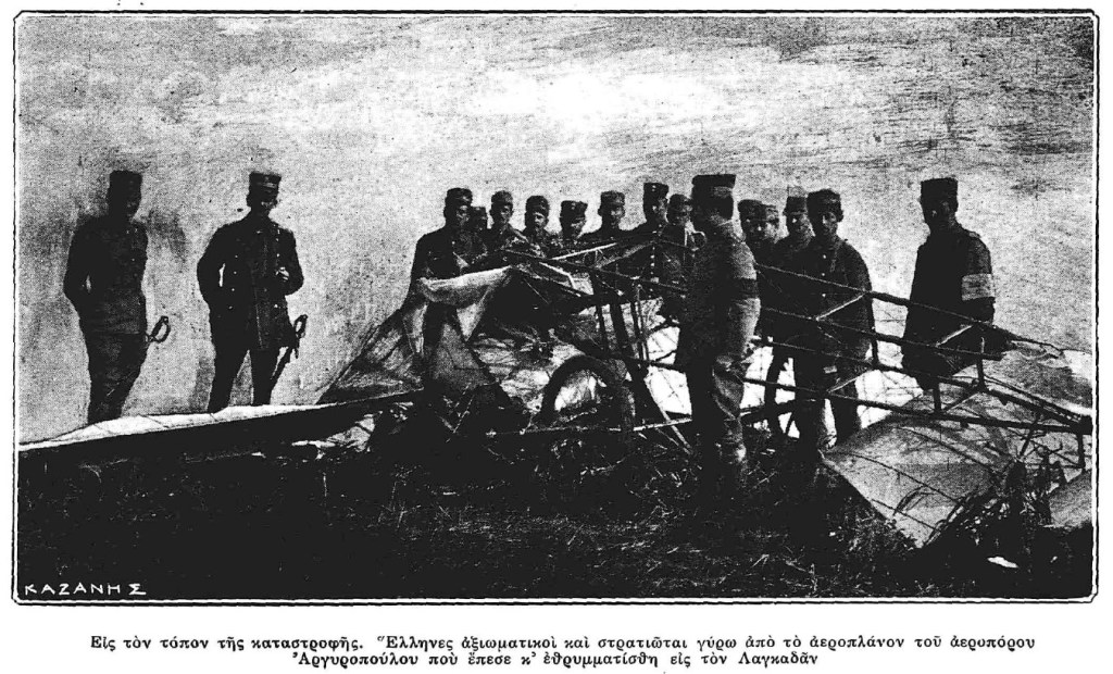 Συντρίμμια του Bleriot XI-2 με το οποίο σκοτώθηκαν ο Εμμανουήλ Αργυρόπουλος και ο Κωνσταντίνος Μάνος (4 Απριλίου 1913). Ήταν ένα από τα αεροπλάνα που παράτησαν οι Οθωμανοί στον παλαιό σιδηροδρομικό σταθμό της Θεσσαλονίκης. Πρέπει να έφερε το όνομα Vatan (Πατρίδα) και σύμφωνα με την τουρκική πλευρά πυρπολήθηκε από το πλήρωμά του πριν εγκαταλειφθεί. Φωτογραφία απο περιοδικό ΠΑΝΑΘΗΝΑΙΑ – Απρίλιος 1913