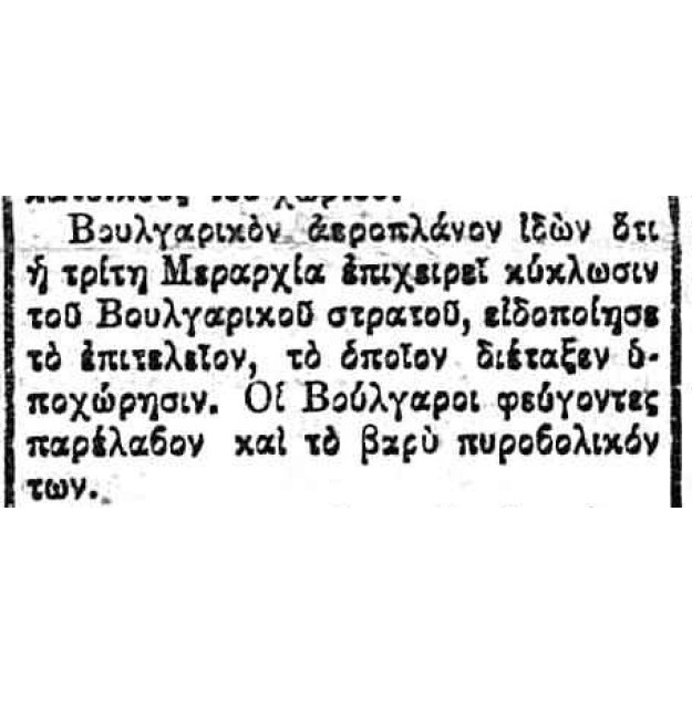 Μια άγνωστη λεπτομέρεια της μάχης του Κιλκίς που καταγράφηκε στις ελληνικές εφημερίδες της εποχής, προσθέτει και αεροπορικές προεκτάσεις στην εξέλιξη της. Η άμεση επίγνωση της δυσμενούς τακτικής κατάστασης από τους Βούλγαρους, όπως αυτή διαμορφώνονταν από την προώθηση της ΙΙΙ Μεραρχίας, δεν ήταν τυχαία. Ένα Βουλγαρικό αεροπλάνο (άραγε το μοναδικό;) που πετούσε πάνω από το μέτωπο, εντόπισε την πλάγια κίνηση της Μεραρχίας και πρόλαβε να ειδοποιήσει το επιτελείο, επισπεύδοντας την υποχώρηση πριν εγκλωβιστεί ο Βουλγαρικός στρατός.