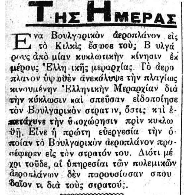 Τελικά, η Μάχη του Κιλκίς είχε και ημέτερη αεροπορική διάσταση, έστω και αν δεν πέταξε κανένα ελληνικό αεροπλάνο εκείνες τις ημέρες. Ίσως το αεροπλάνο που πρόλαβε την ολοκληρωτική καταστροφή του Βουλγαρικού στρατού, να ήταν αυτό που έπεσε σε ελληνικά χέρια.