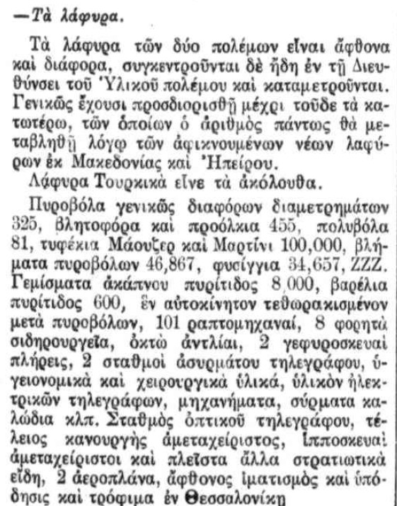 Οι Βαλκανικοί Πόλεμοι είχαν τερματιστεί και στις 28 Ιουλίου είχε υπογραφεί η Συνθήκη του Βουκουρεστίου, εξασφαλίζοντας σχεδόν τον διπλασιασμό της χώρας με την προσάρτηση σημαντικού μέρους της Ηπείρου και της Μακεδονίας. Η νικήτρια Ελλάδα μετρούσε εκτός από εδαφικά οφέλη και τα λάφυρα πολέμου. Η καταμέτρηση από τη Διεύθυνση Υλικού Πολέμου συνεχίζονταν, με το περιοδικό ΠΑΡΝΑΣΣΟΣ να παρέχει λίστα με τις ποσότητες που είχαν καταγραφεί ως εκείνη τη στιγμή.