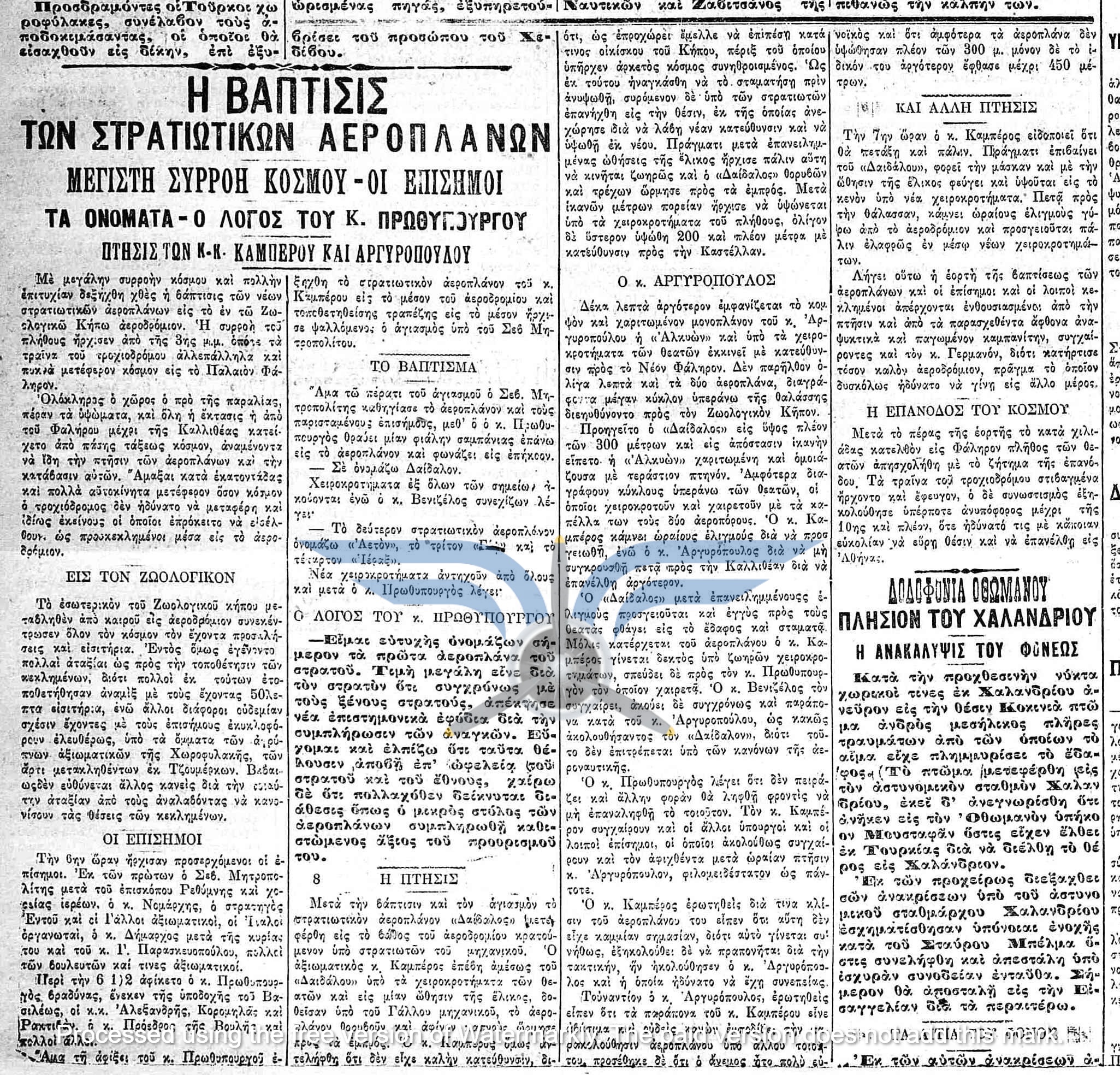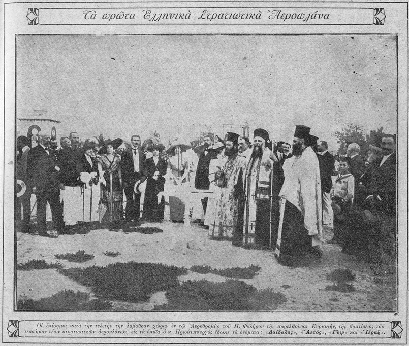 Χωρίς να έχει προηγηθεί δημοσίευμα για την άφιξη του τέταρτου αεροπλάνου, η 27η Μαΐου 1912 μπορεί να θεωρηθεί ως η εναρκτήρια ημερομηνία της επίσημης ιστορίας της ελληνικής Πολεμικής Αεροπορίας. Εκείνη την ημέρα, ουσιαστικά σε μια τελετή ένταξης των πρώτων ελληνικών αεροπλάνων σε υπηρεσία, ο Ελευθέριος Βενιζέλος προχώρησε στη βάπτιση των τεσσάρων αεροπλάνων. Αρχικώς υπήρχαν αναφορές για ονοματοδοσία μόνο του πρώτου, τελικώς όμως βαπτίστηκαν και τα τέσσερα. Ιδιαίτερο ενδιαφέρον παρουσιάζει το γεγονός ότι, σύμφωνα με τα λόγια του ίδιου του Βενιζέλου, στο Φάληρο βρίσκονταν μόνον δύο αεροπλάνα, ενώ τα άλλα δύο βαπτίστηκαν ερήμην, καθώς βρίσκονταν στον Πειραιά: <<Εις το πρώτο τούτο σκάφος του εναέριου στόλου δίδω το όνομα ΔΑΙΔΑΛΟΣ, του πρώτου Έλληνος, όστις διέσχισε τας εναερίους εκτάσεις. Εις το δεύτερο δίδω το όνομα ΑΕΤΟΣ και εις τα άλλα εν Πειραιεί ευρισκόμενα τα ονόματα ΙΕΡΑΞ και ΓΥΨ>>. Η παρουσία των δύο τελευταίων στον Πειραιά υποδηλώνει ότι παρέμεναν ακόμη στα κιβώτια μεταφοράς τους, εν αναμονή συναρμολόγησης από τον Chauveau. Με μοναδικό στρατιωτικό αεροπόρο στην Ελλάδα τον Καμπέρο και μόλις δύο επιχειρησιακά έτοιμα αεροπλάνα, δεν υπήρχε άλλωστε ιδιαίτερη πίεση για άμεση συναρμολόγηση των υπολοίπων.