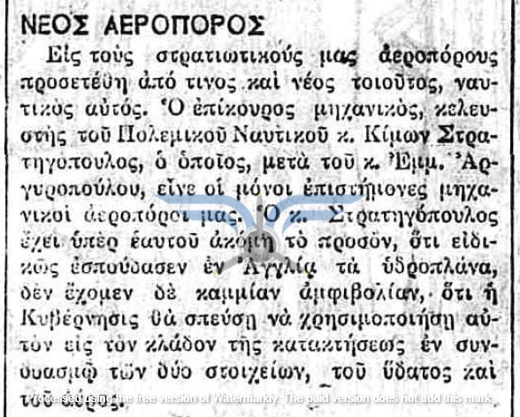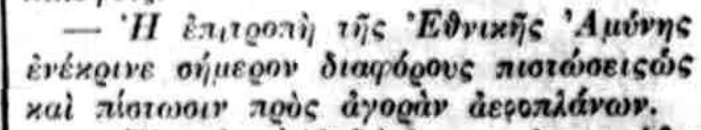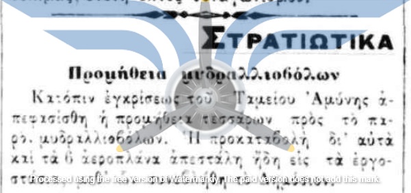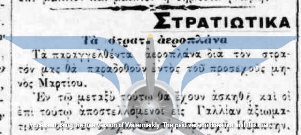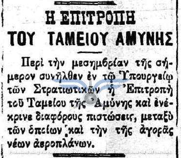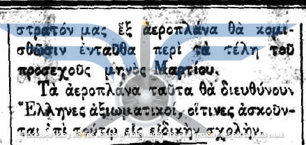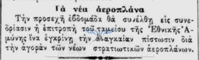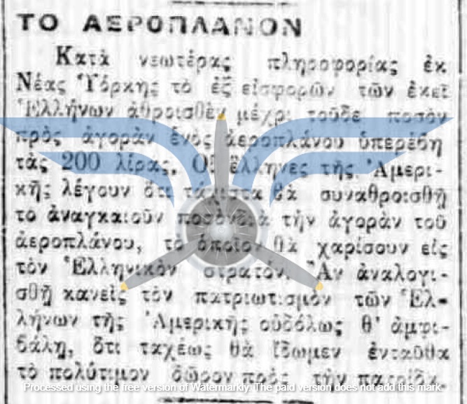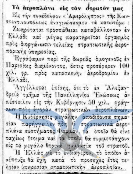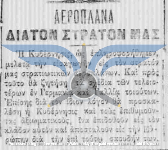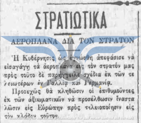 Οι πρώτες δημοσιεύσεις σχετικά με πρόθεση αγοράς αεροπλάνων για τον Στρατό εντοπίζονται τον Νοέμβριο του 1910, αρκετούς μήνες πριν από την πρώτη επιτυχημένη πτήση στην Ελλάδα (Sergei Utochkin, 25/03/1911). Ως χώρες προμήθειας των αεροπλάνων αναφέρονται η Γαλλία και η Γερμανία, ενώ σχεδόν ταυτόχρονα εκδηλώθηκε και η επιθυμία δωρεάς αεροπλάνου από Έλληνες ομογενείς της Αμερικής.