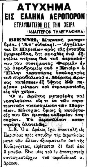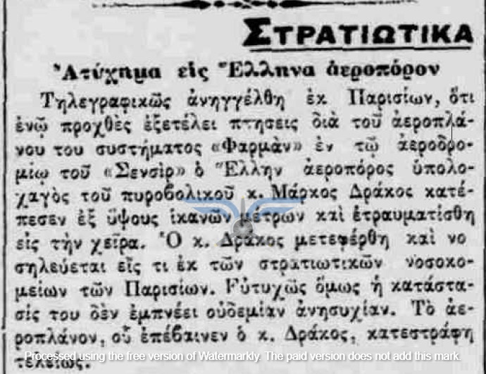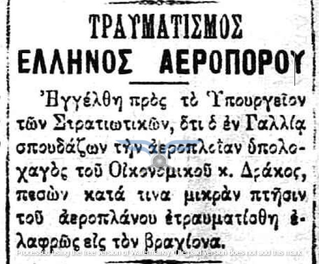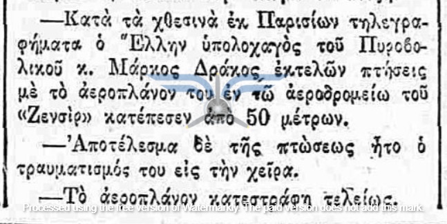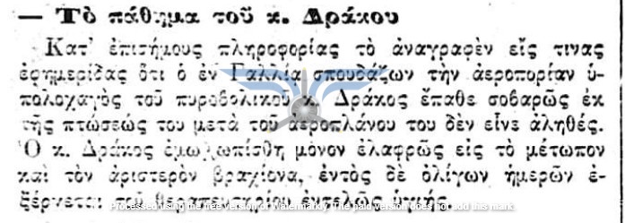 Καθώς το καλοκαίρι προχωρούσε, οι Έλληνες αεροπόροι εξακολουθούσαν να παραμένουν στη Γαλλία, γεγονός που δημιουργούσε ερωτήματα για τη μακρά διάρκεια της εκπαίδευσής τους. Η ελληνική αποστολή και η εκπαιδευτική διαδικασία, θα δεχθούν σύντομα ένα σημαντικό πλήγμα. Στις 07/07/1912, ο Υπολοχαγός Δράκος ενεπλάκη σε μείζον αεροπορικό ατύχημα, όταν το αεροπλάνο του κατέπεσε από ύψος περίπου 50 μέτρων υπό αδιευκρίνιστες συνθήκες. Ο ίδιος τραυματίστηκε σχετικά ελαφρά στα χέρια, αλλά το αεροσκάφος υπέστη σημαντικές ζημιές, πιθανώς και ολική καταστροφή.
