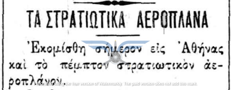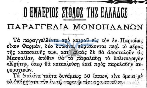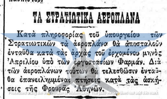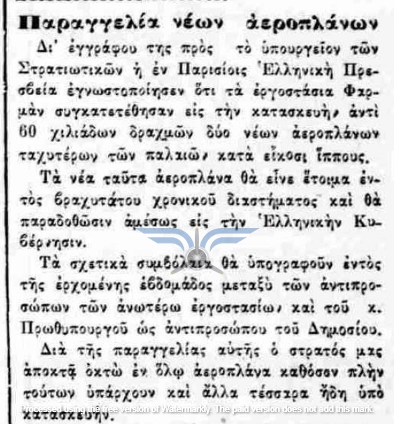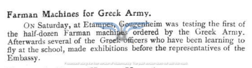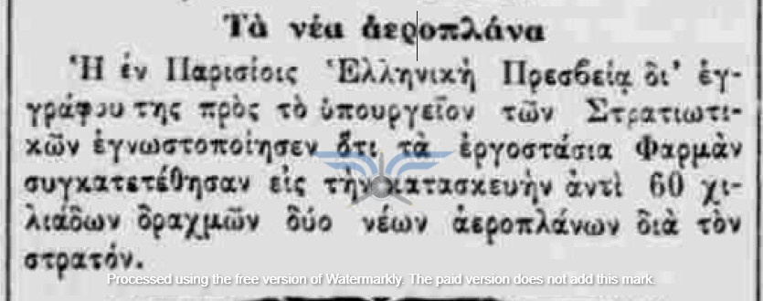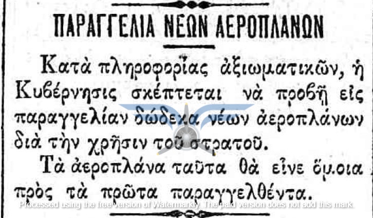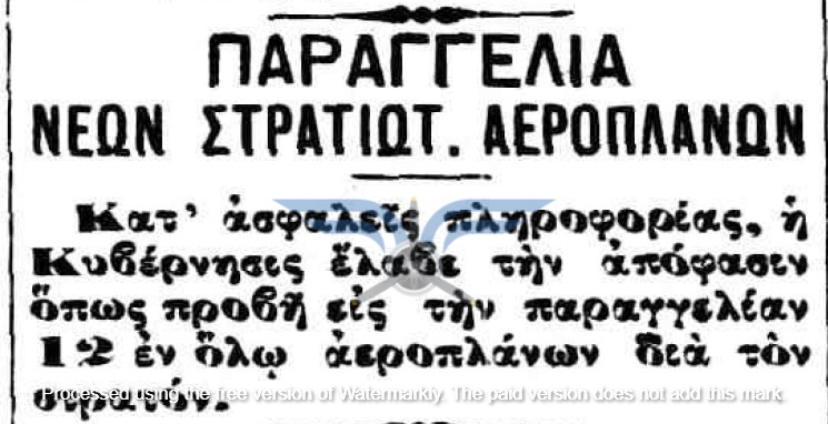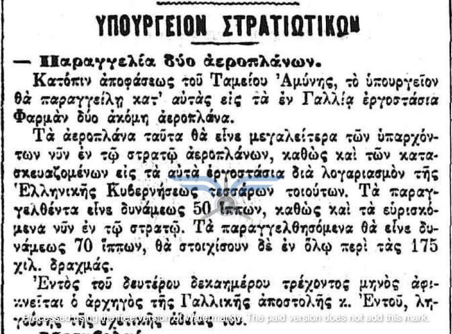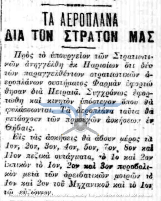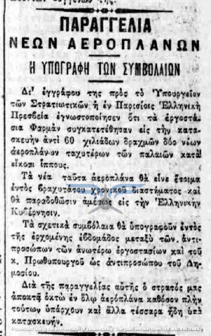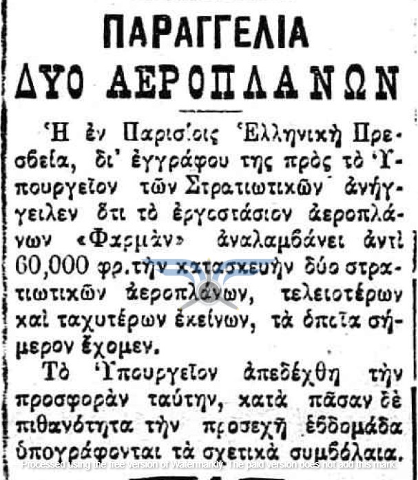 Η επιβεβαίωση ύπαρξης ενεργής παραγγελίας αεροπλάνων, τόσο ως προς τον αριθμό όσο και ως προς τον κατασκευαστικό οίκο, εμφανίζεται στην εφημερίδα ΑΘΗΝΑΙ (08/11/1911), σε άρθρο που αφορά δωρεές ομογενών για την κατασκευή αεροδρομίου και την αγορά αεροπλάνων: <<Η Κυβέρνησις μεγάλην αποδίσουσα σημασία παρήγγειλεν ήδη 6 στρατιωτικά αεροπλάνα συστήματος Φαρμάν, τα οποία θα είνε ταχέως έτοιμα και τα οποία θα συμμετάσχουν εις τα μεγάλα θερινά γυμνάσια του Στρατού>>. Η ίδια εφημερίδα ενημερώνει στις 21/11/1911 ότι τα αεροπλάνα θα παραδοθούν τον επόμενο Μάρτιο.