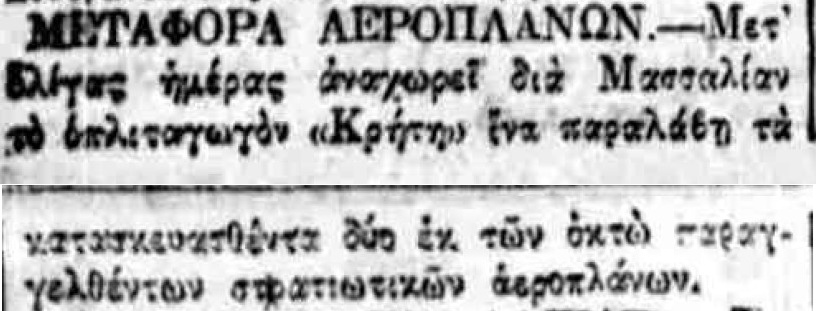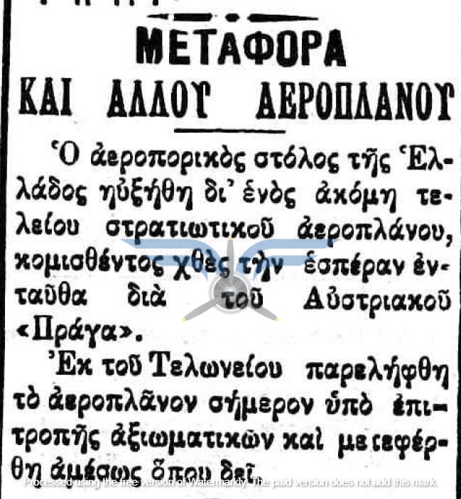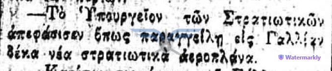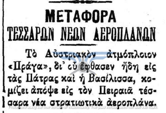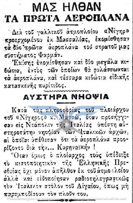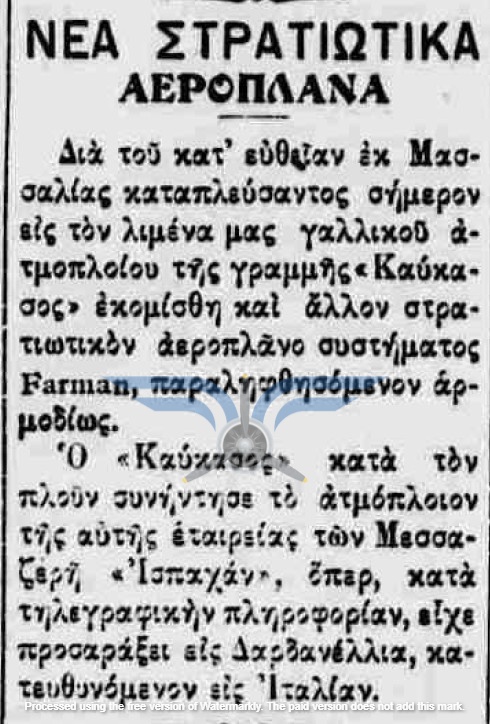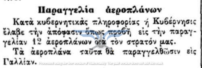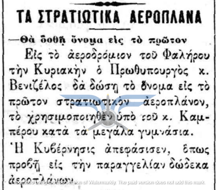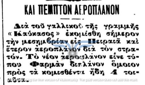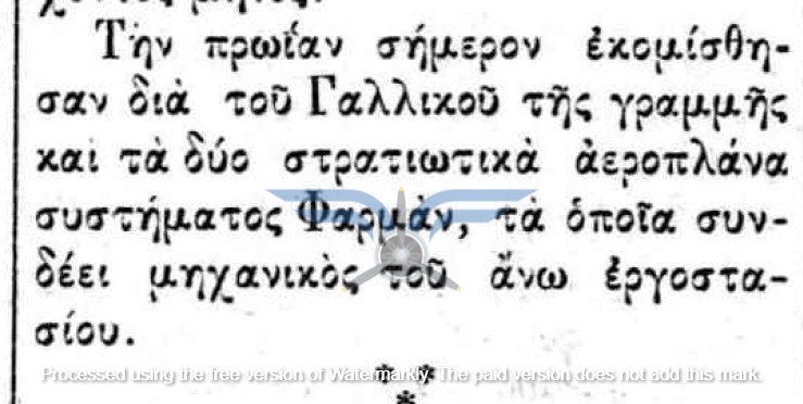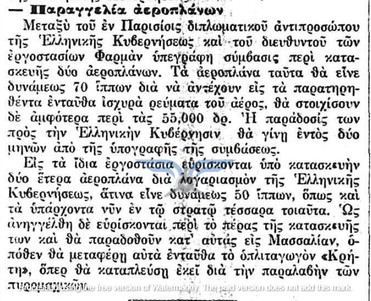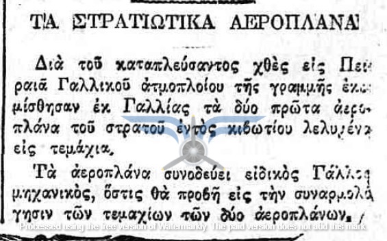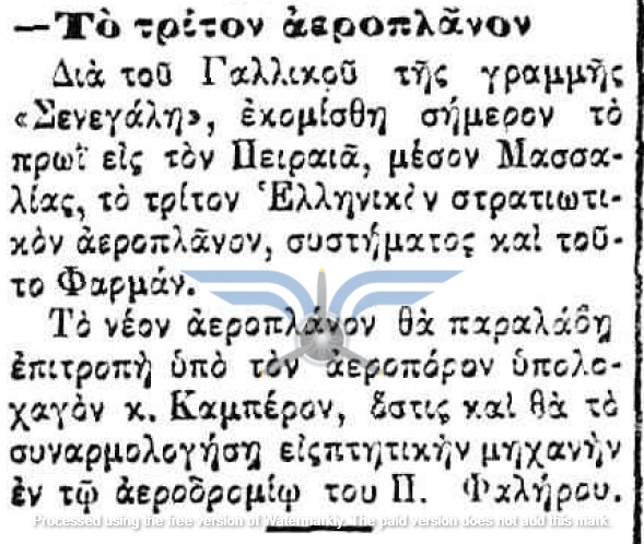 Η επιβεβαίωση ύπαρξης ενεργής παραγγελίας αεροπλάνων, τόσο ως προς τον αριθμό όσο και ως προς τον κατασκευαστικό οίκο, εμφανίζεται στην εφημερίδα ΑΘΗΝΑΙ (08/11/1911), σε άρθρο που αφορά δωρεές ομογενών για την κατασκευή αεροδρομίου και την αγορά αεροπλάνων: <<Η Κυβέρνησις μεγάλην αποδίσουσα σημασία παρήγγειλεν ήδη 6 στρατιωτικά αεροπλάνα συστήματος Φαρμάν, τα οποία θα είνε ταχέως έτοιμα και τα οποία θα συμμετάσχουν εις τα μεγάλα θερινά γυμνάσια του Στρατού>>. Η ίδια εφημερίδα ενημερώνει στις 21/11/1911 ότι τα αεροπλάνα θα παραδοθούν τον επόμενο Μάρτιο.