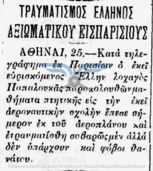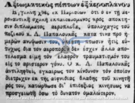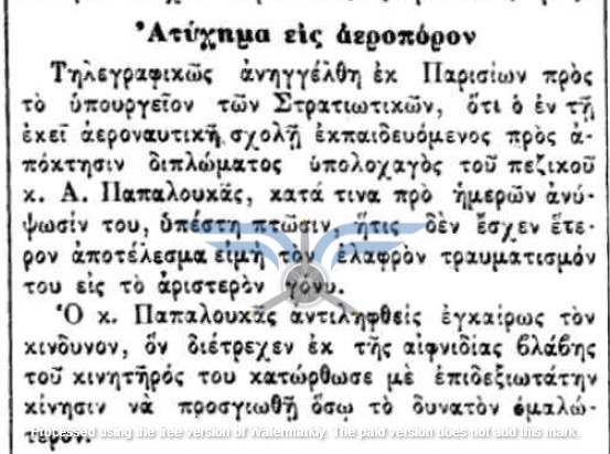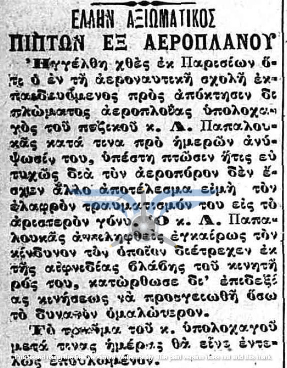 Εν τω μεταξύ, οι πτήσεις των Ελλήνων εκπαιδευόμενων αεροπόρων στη Γαλλία συνεχίζονταν, όχι πάντα χωρίς προβλήματα. Στις 25/04/1912, ο Υπολοχαγός Παπαλουκάς αντιμετώπισε βλάβη στον κινητήρα του αεροπλάνου του και πραγματοποίησε αναγκαστική προσγείωση. Ο ίδιος τραυματίστηκε στο αριστερό γόνατο και εκτιμήθηκε ότι θα αναρρώσει σύντομα, χωρίς όμως να δίνονται συγκεκριμένες πληροφορίες για την κατάσταση του αεροσκάφους. Το γεγονός ότι κατάφερε να προσγειωθεί <<το δυνατόν ομαλότερα>> δεν αναιρεί την πιθανότητα σοβαρών ζημιών, ιδίως από τη στιγμή που υπήρξε τραυματισμός του αεροπόρου. Είναι, συνεπώς, εύλογο να υποτεθεί ότι για κάποιο χρονικό διάστημα ένα από τα ελληνικά Farman βρέθηκε εκτός ενεργείας.