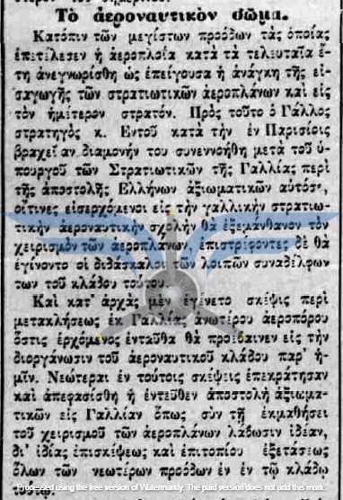 Κατά το 1911, από τον Μάιο αρχίζουν να εμφανίζονται σποραδικές ειδήσεις για οργανωτικά ζητήματα του Στρατού, σε σχέση με τη σχεδιαζόμενη δημιουργία λόχων αεροπλάνων, τους αξιωματικούς που θα σταλούν για εκπαίδευση στην αεροπλοΐα και τη δημιουργία των αναγκαίων υποδομών. Τον Σεπτέμβριο αρχίζει να ξεκαθαρίζει το τοπίο σχετικά με τον αριθμό των αξιωματικών που θα λάβουν αεροπορική εκπαίδευση στη Γαλλία και τον αριθμό των αεροπλάνων που θα παραγγελθούν. Με βάση τα δεδομένα της περιόδου, οι εκπαιδευόμενοι θα ήταν αρχικά τρεις, λόγω αδυναμίας του εκπαιδευτικού κέντρου να δεχθεί περισσότερους, και σύμφωνα με την εφημερίδα ΣΦΑΙΡΑ (15/09/1911), τρία θα ήταν και τα υπό προμήθεια αεροπλάνα. Λίγες ημέρες αργότερα, η ΑΜΑΛΘΕΙΑ (23/09/1911) ανέβασε τον αριθμό των προς παραγγελία αεροπλάνων σε έξι, με τη σημαντική επισήμανση ότι οι Έλληνες εκπαιδευόμενοι θα επιβλέψουν την κατασκευή των αεροσκαφών.