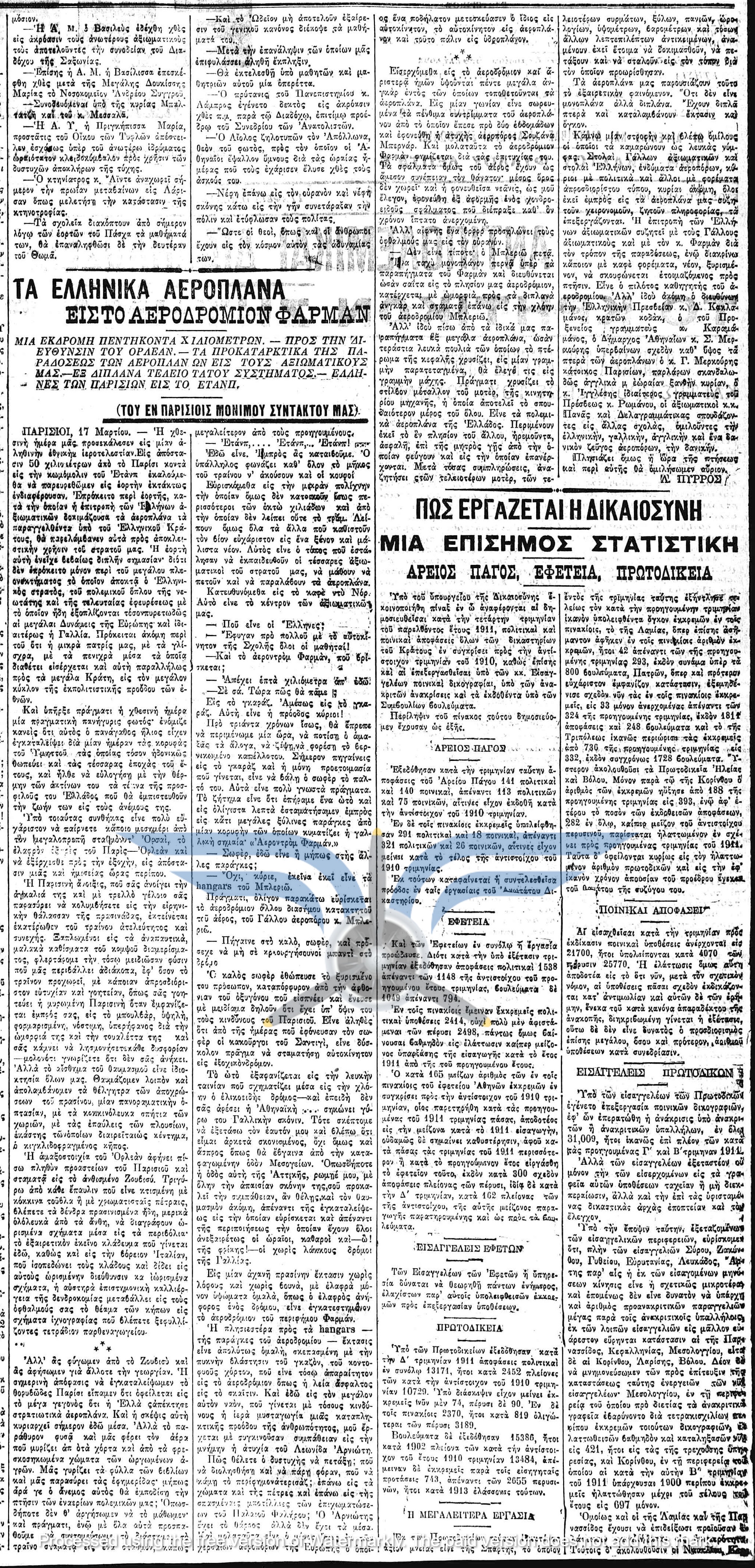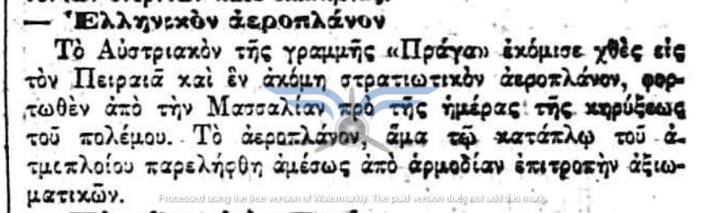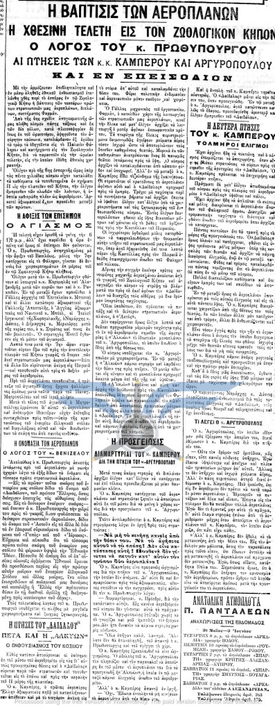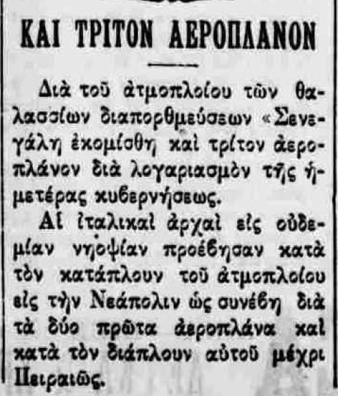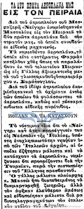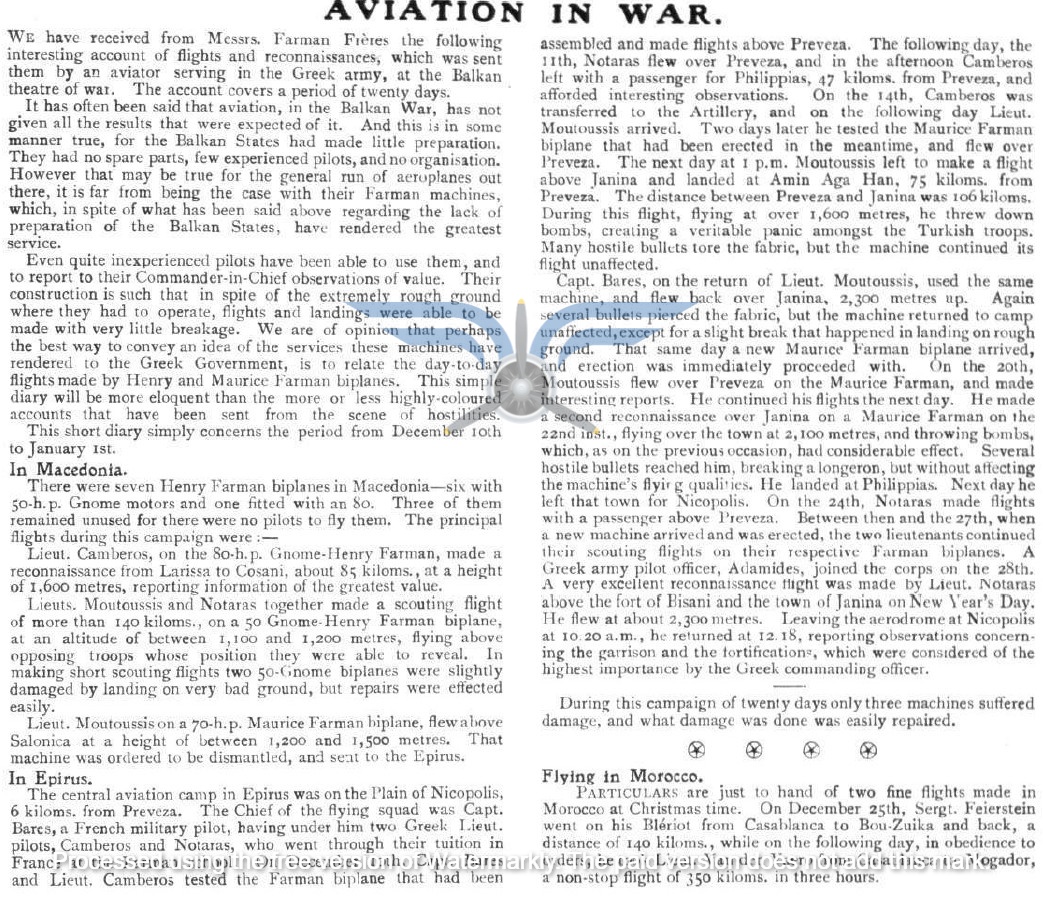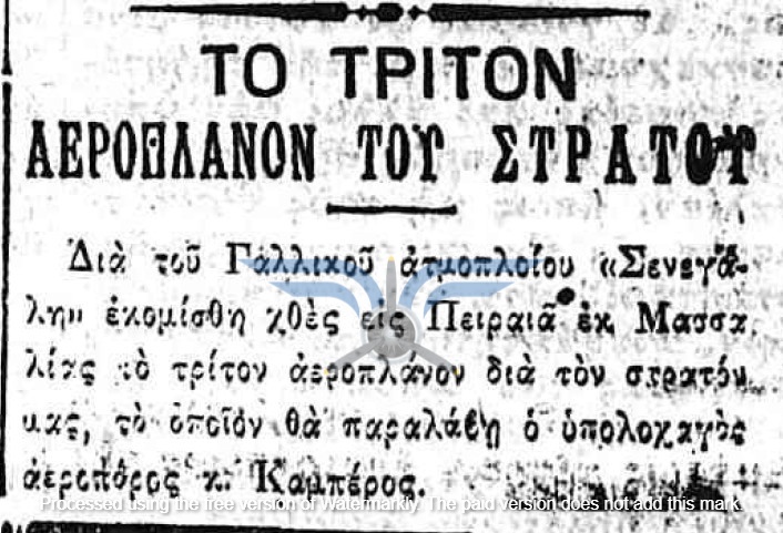 Το 1912 αποτελεί, ουσιαστικά, τη χρονιά γέννησης της ελληνικής αεροπορίας. Κατά τους πρώτους μήνες της χρονιάς, την επικαιρότητα απασχολούν οι πρώτοι Έλληνες ιδιώτες αεροπόροι, Εμμανουήλ Αργυρόπουλος και Αλέξανδρος Καραμανλάκης. Παράλληλα, συνεχίζεται ο προγραμματισμός για τον στρατιωτικό εναέριο στόλο, με τον αρχηγό της Γαλλικής Στρατιωτικής Αποστολής, στρατηγό Joseph-Paul Eydoux, να δηλώνει ότι εντός ενός έτους η Ελλάδα θα διαθέτει επτά αεροπλάνα και εντός δύο ετών ο αριθμός τους θα φτάσει τα δώδεκα. Σύμφωνα με πολλαπλά δημοσιεύματα, οι παραδόσεις των έξι πρώτων ελληνικών αεροπλάνων αναμένονταν προς τα τέλη Μαρτίου.