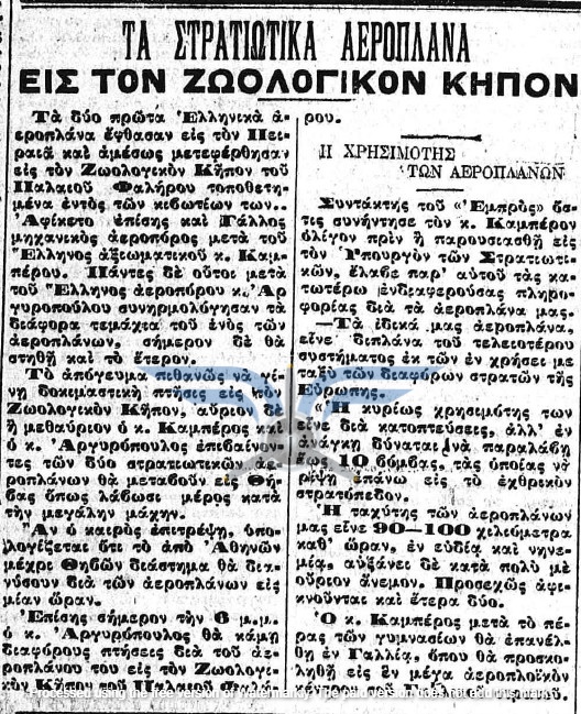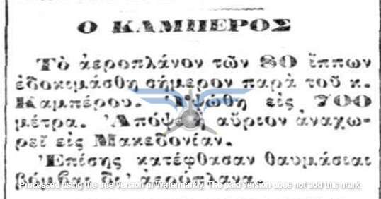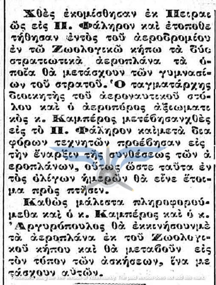 Στις 12/05/1912 έγινε γνωστή η άφιξη στην Ελλάδα του αεροπόρου Δημητρίου Καμπέρου, συνοδευόμενου από τον Γάλλο μηχανικό Albert Chauveau. Την ίδια ημέρα, τα δύο αεροπλάνα μεταφέρθηκαν από τον Πειραιά στο Φάληρο και ο Chauveau, μαζί με τον Καμπέρο και τον Εμμανουήλ Αργυρόπουλο, με τη βοήθεια περίπου δεκαπέντε στρατιωτών, συναρμολόγησαν το πρώτο αεροπλάνο, ενώ την επόμενη ημέρα θα προχωρούσαν στη συναρμολόγηση και του δεύτερου.
