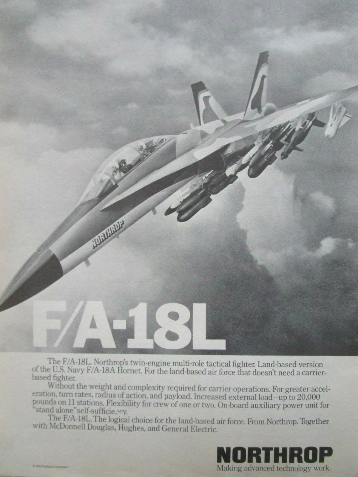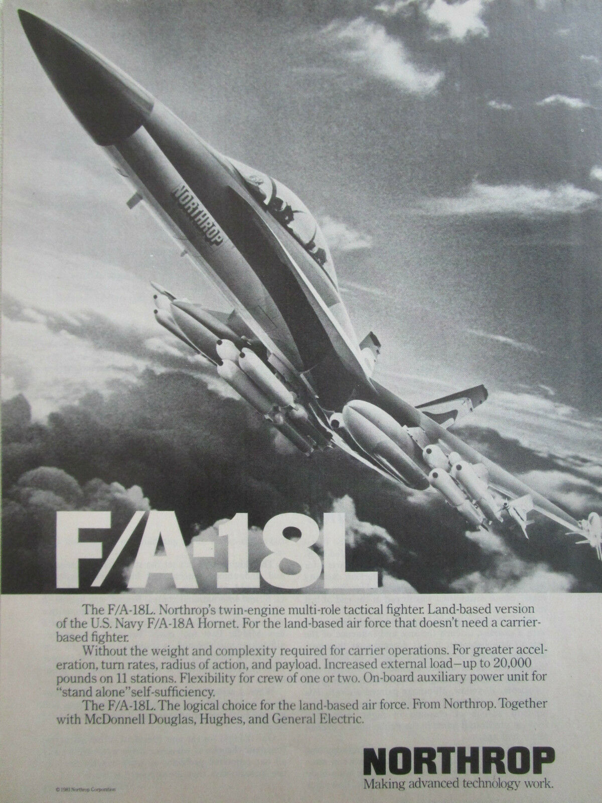 Η Northrop ήταν υπεύθυνη για την ανάπτυξη και προώθηση της έκδοση ξηράς (L: Land) του F-18. Μοιραζόμενο σχεδόν το σύνολο των συστημάτων με το F-18A, υπόσχονταν καλύτερες επιδόσεις, απαλλαγμένο από τις προβλέψεις για επιχειρήσεις από αεροπλανοφόρα. Στα πλαίσια της εμπορικής προώθησής του στη χώρα μας, ενόψει της ΄΄αγοράς του αιώνα΄΄, βάφτηκε και πέταξε με ελληνικά εθνόσημα και με Έλληνες χειριστές, ένα από τα πρωτότυπα του YF-17, καθώς η πραγματική έκδοση L, υπήρχε μόνο στα χαρτιά. Μετά από δικαστική διαμάχη με την McDonnell Douglas, έπαψε να είναι διαθέσιμο το 1985 και δεν υιοθετήθηκε από καμία χώρα.